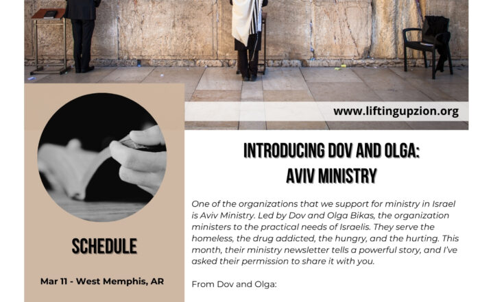 One of the organizations that we support for ministry in Israel is Aviv Ministry. Led by Dov and Olga Bikas, the organization ministers to the practical needs of Israelis. They serve the homeless, the drug [...]